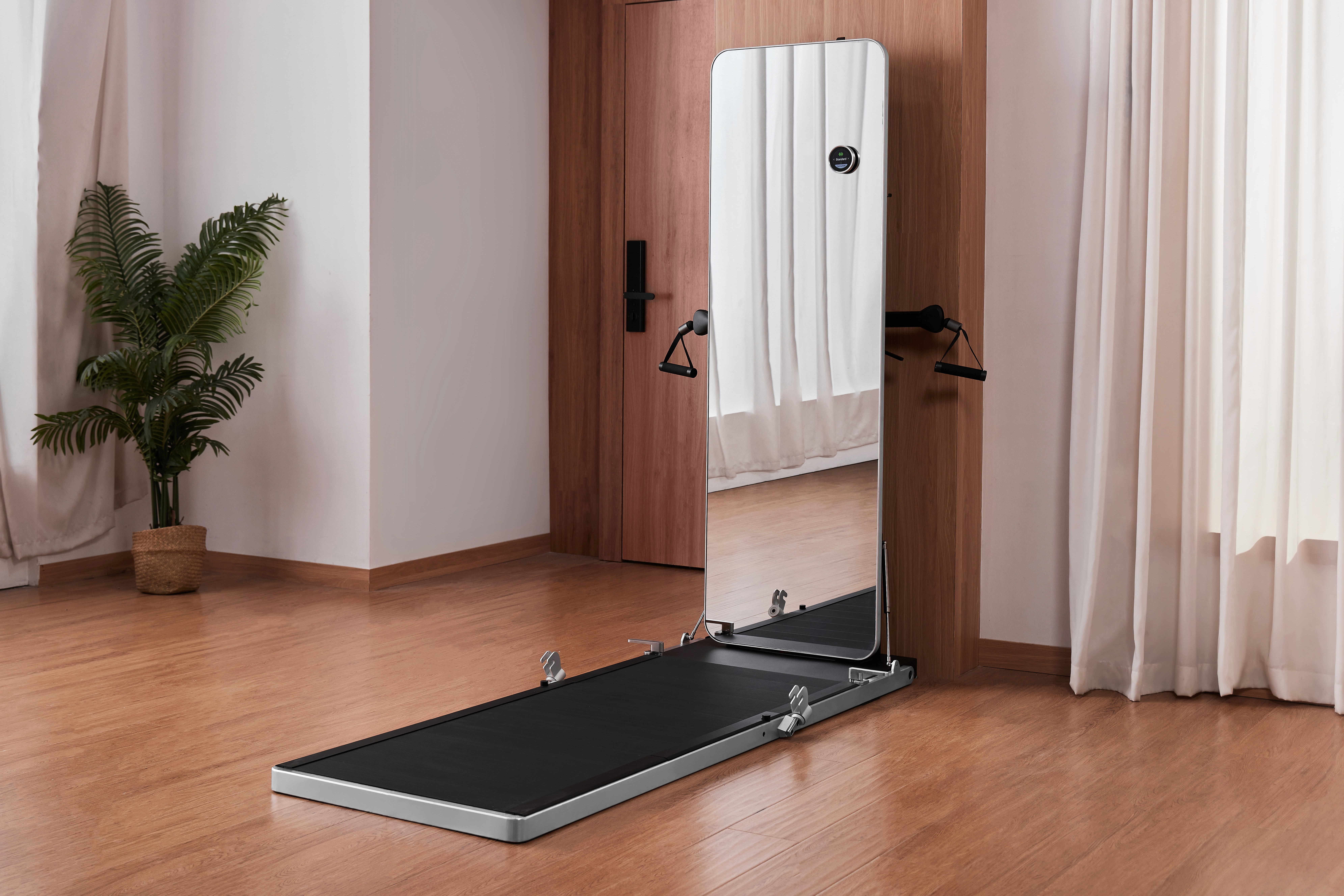 Existem dois pontos interessantes na linha E que se destacam das demais linhas: não requer instalação na parede e, ainda assim, é muito compacto. A própria moldura dele é a que desce e vira a plataforma de treino, dando equilíbrio e sustentação ao equipamento.