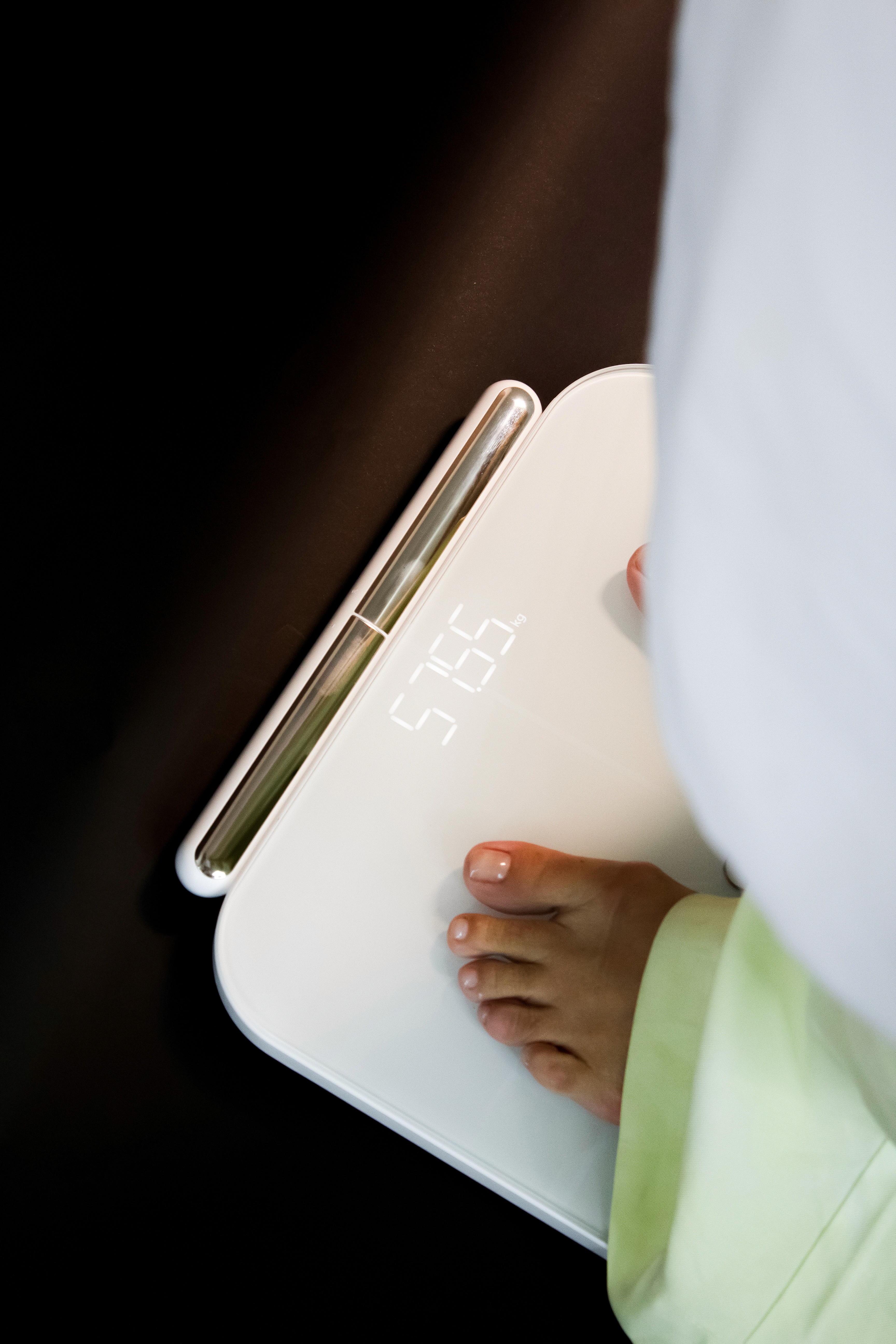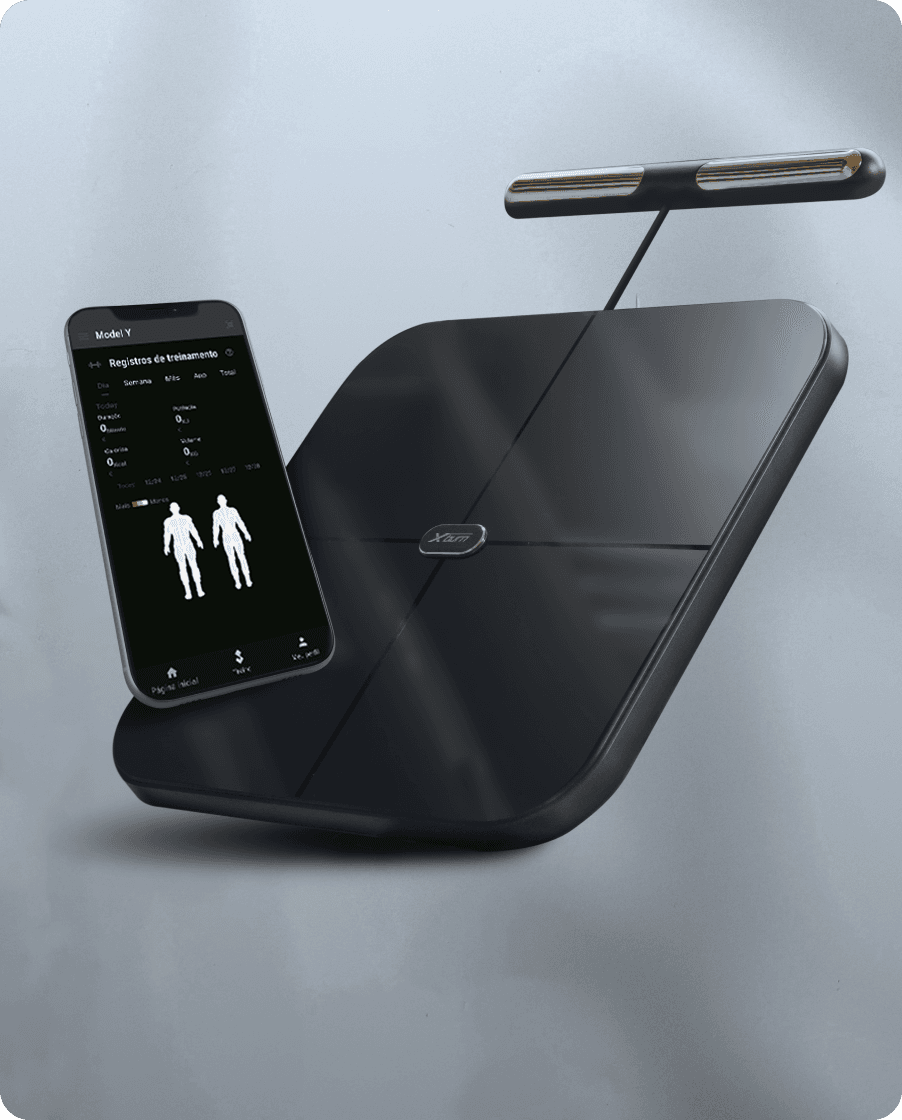 Medição completa de composição corporal, incluindo mais de 40 indicadores (gordura visceral, músculo esquelético, idade corporal, controle de gordura e músculo etc.).
